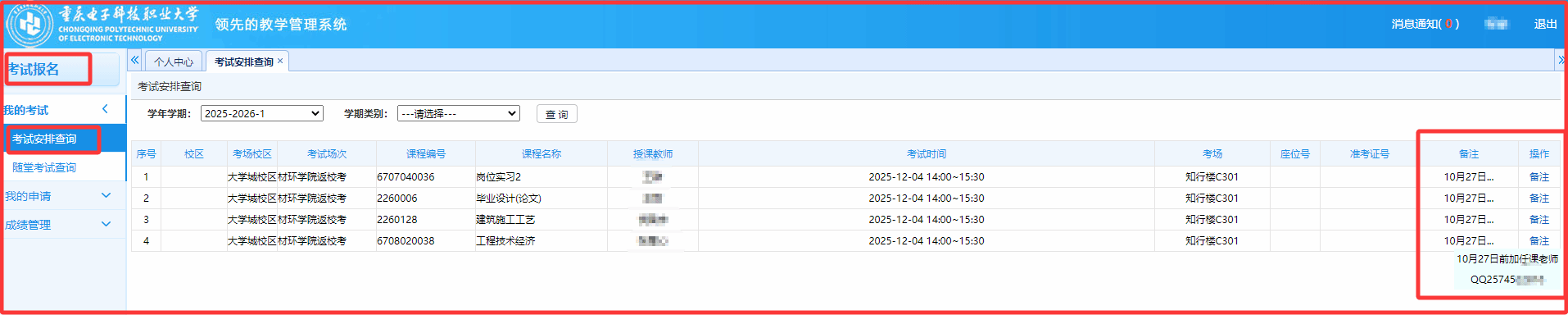 7、专业课重修,学生在个人教务管理系统,点击“考试报名”,进入“我的考试”-“考试安排查询”,点击正确学期“查询”,在备注处也可查询重修课程任课教师联系方式。