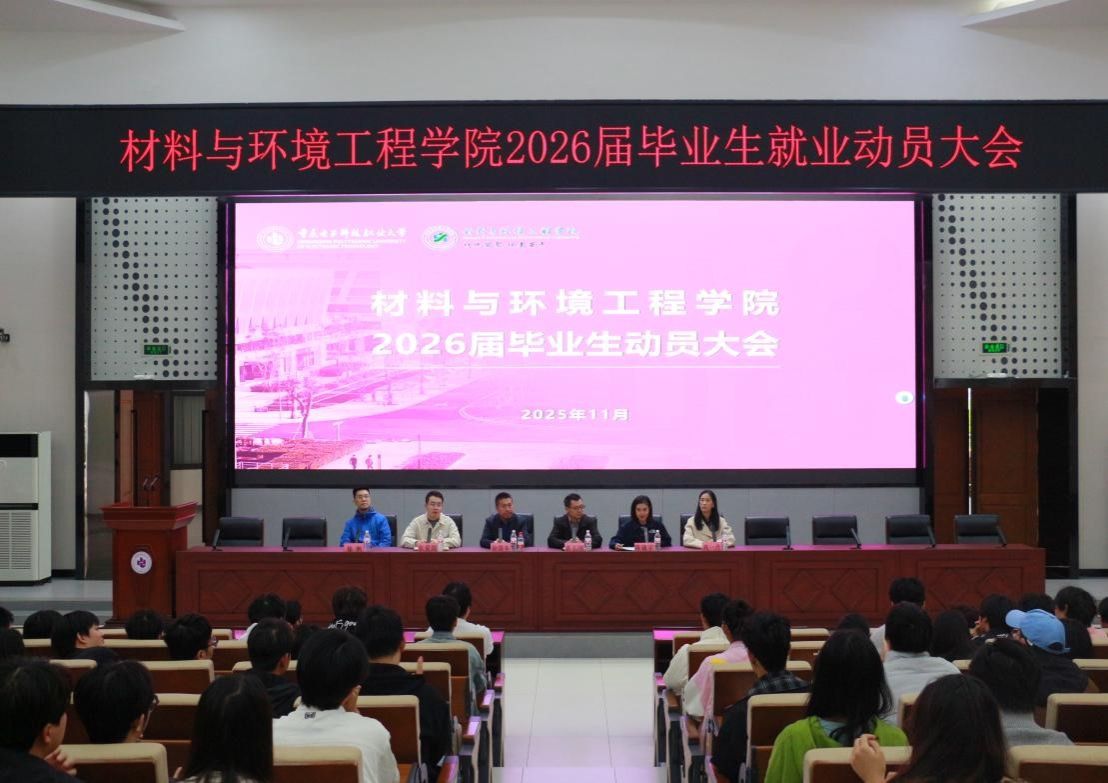 11月3日,重庆电子科技职业大学材料与环境工程学院在博远厅组织召开2026届毕业生就业动员大会暨中核二三建设有限公司专场招聘会。材料与环境工程学院党总支书记、副院长袁玉刚,中核二三招聘负责人徐国冬,学管科科长陈镜宇,全体毕业班辅导员及2026届毕业生参加大会。