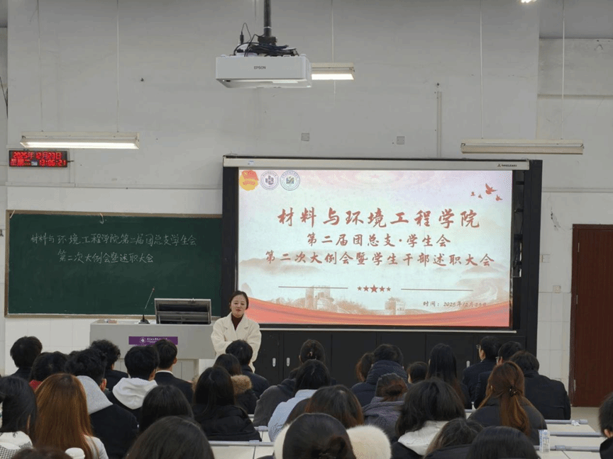 材料与环境工程学院团总支书记余婕进行总结讲话。余婕老师对团总支·学生会全体成员的辛勤付出与突出贡献表示肯定和感谢,期望大家秉持 “全心全意为同学服务” 的宗旨,提升自身能力、创新工作方法,以更饱满热情和务实作风投入后续工作,切实为同学解决实际问题、为学院建设添砖加瓦。